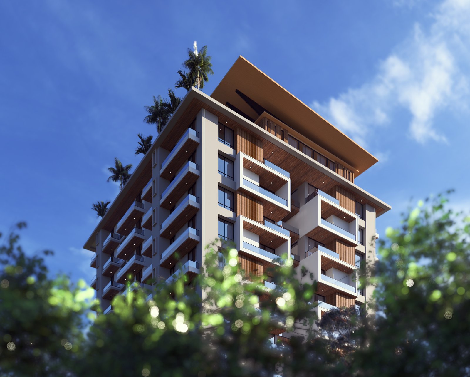 Architecturally, the building features a contemporary façade defined by clean vertical lines, bold boxing elements, and warm wooden textures that give it a distinctive identity. The staggered balconies add depth and rhythm to the elevation, while the club floor on the terrace—with its open views, pool deck, and premium facilities—forms the visual highlight of the structure, expressing a refined and modern design language.