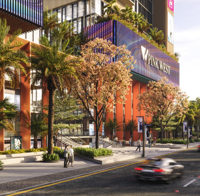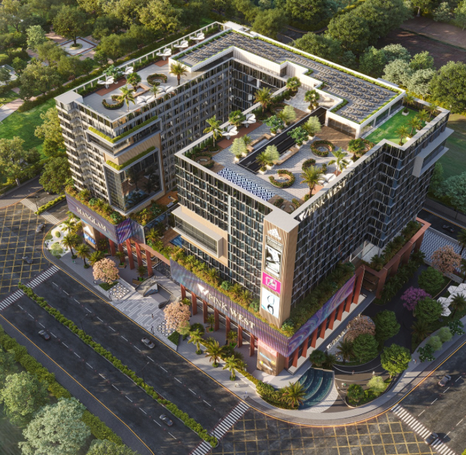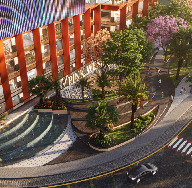 Its bold architectural identity—featuring a striking multi-coloured façade, expansive retail frontage, grand colonnades, and lush landscaped terraces—creates a fresh and iconic presence along the corridor. The retail podium is designed with double-height storefronts, generous walkways, and seamless circulation, hosting leading national and international brands for an elevated visitor experience. Rising above is a modern office tower with flexible floor plates, abundant natural light, and panoramic views tailored for new-age enterprises. Carefully planned pedestrian pathways, greenery, outdoor seating pockets, and efficient vehicular flow ensure a smooth and welcoming arrival. With its dynamic design and integrated functionality, Pink West blends commerce, lifestyle, and architecture—setting a new benchmark for Jaipur’s contemporary skyline.