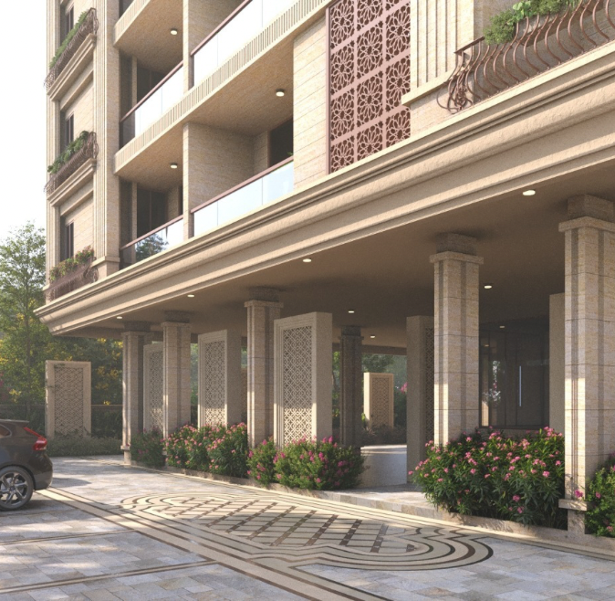Rudraksh is a boutique residential development that blends refined architecture with quiet luxury. Its elegant façade—marked by arches, stone textures, and crafted jali details—creates a timeless identity, while each 1, 2, and 3 BHK home is designed for privacy, natural light, and seamless ventilation across its eight thoughtfully planned floors.