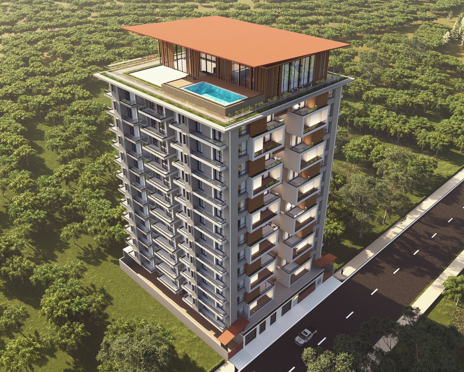 Architecturally, the building features a contemporary façade defined by clean vertical lines, bold boxing elements, and warm wooden textures that give it a distinctive identity. The staggered balconies add depth and rhythm to the elevation, while the club floor on the terrace—with its open views, pool deck, and premium facilities—forms the visual highlight of the structure, expressing a refined and modern design language.